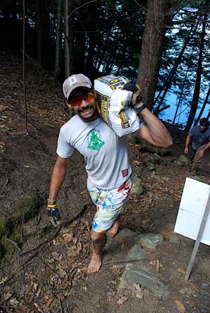 After hauling more than 4,000 pounds of concrete mix to the island by canoe, crewmember Kate Bowman (not shown) explains how they mixed it “based on an extremely precise and scientific process known as ‘well that looks about right.'”