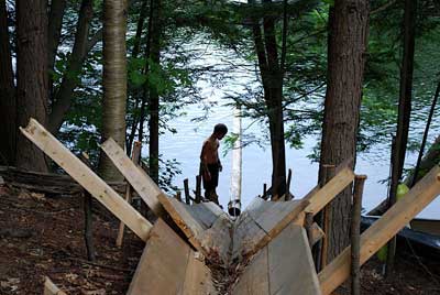 To ease the transport of materials from the river to the building site, the crew built a 40-foot-long ramp up the slope, which was promptly dubbed “the death slide.” Aside from just hauling building materials up, team leader Greg Sokol admits, “It happened to fit a whitewater kayak perfectly.”