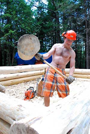Volunteer Dave Goldberg hesitatingly wields “Gorgeous George,” a 60-pound, custom-made mallet that helped shift the stacked logs.