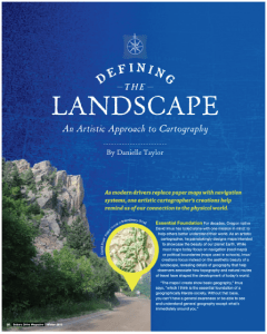 Defining the Landscape — Subaru Drive, Winter 2016 — Since I always knew I wanted to write about how people interact with their physical environments, I added a degree in human geography to my college studies in journalism and English, and it came in really handy for this article in particular. Artistic cartographer Dave Imus personifies complete dedication to a project, and while I sat in my Subaru behind a library in Minneapolis, we had a great map geek phone chat about different types of map projections, ways to visually represent 3D topography on a 2D surface, the million inscrutably minuscule decisions he makes each time he brings a new map to life, and how the field of cartography badly needs the artistry and detail found in medical and botanical illustrations. I loved his one offhand comment about how people run their fingers over the shaded hills portrayed on his paper maps and are surprised that they don’t feel bumps.